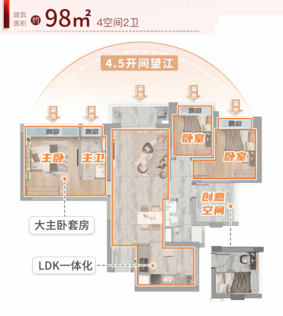 98㎡四房两卫户型,则被称为“万能户型”。正在百平以内做到四房设想,实属稀有。这款户型不只空间操纵率高,并且功能分区明白。从卧套房设想,私密性强,部门户型还能俯瞰江景,视野绝佳。三个次卧矫捷多变,能够做为儿童房、白叟房、书房或客房利用,满脚了家庭成长的多种需求。客堂面宽较大,采光极佳,营制出大气的栖身空气。总价约382万元起,即可具有如许一套功能完整的四房,对于逃求高性价比的改善客户来说,极具吸引力。